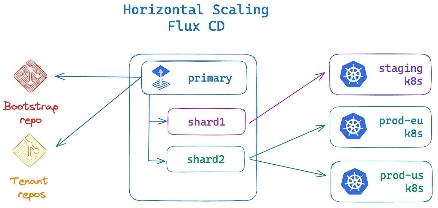 When managing a large number of spoke clusters, the hub cluster can be sharded to distribute the reconciliation load across multiple Flux instances.