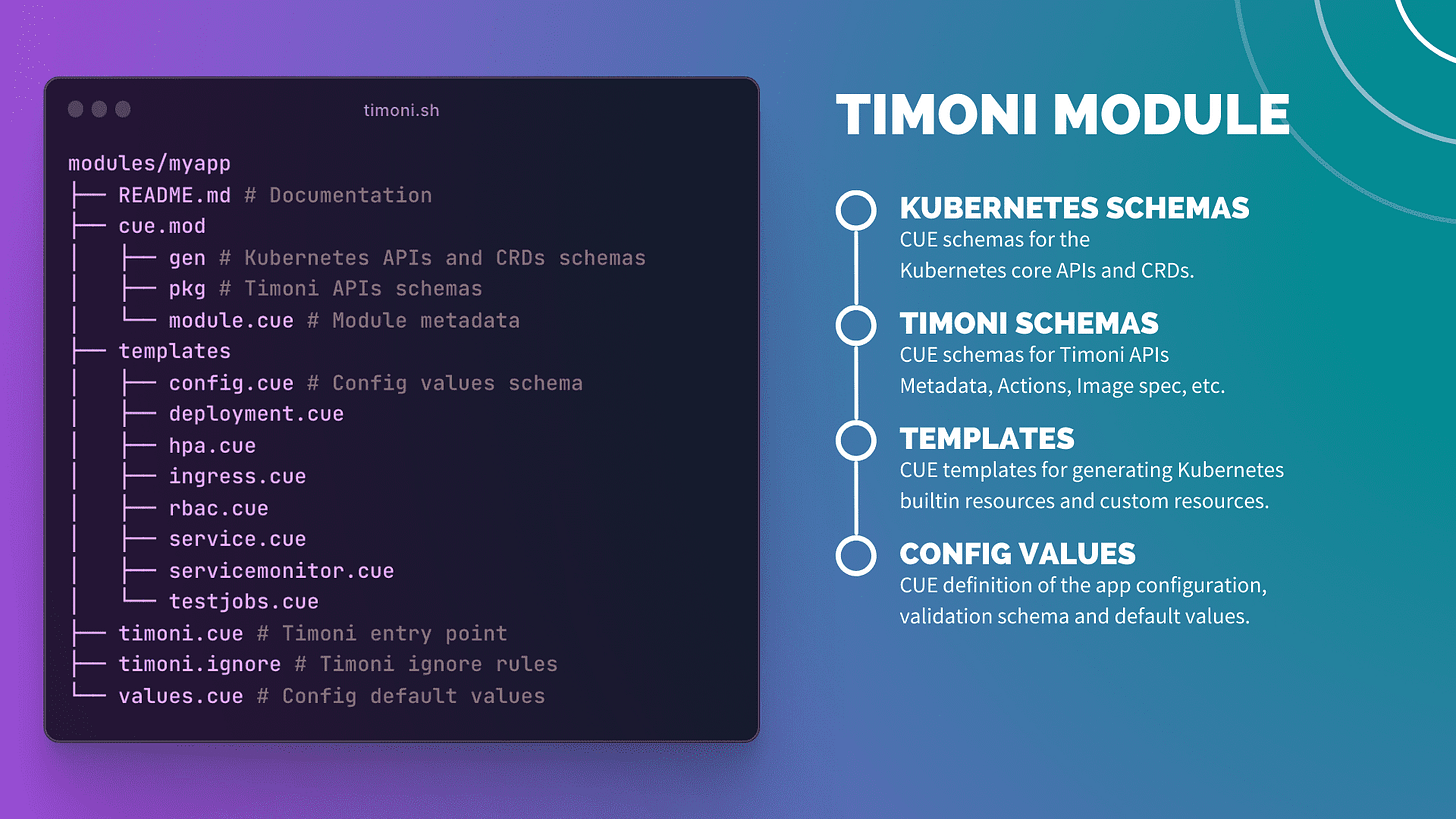 A Timoni module contains a set of CUE definitions and constraints organised into a CUE module with an opinionated structure.