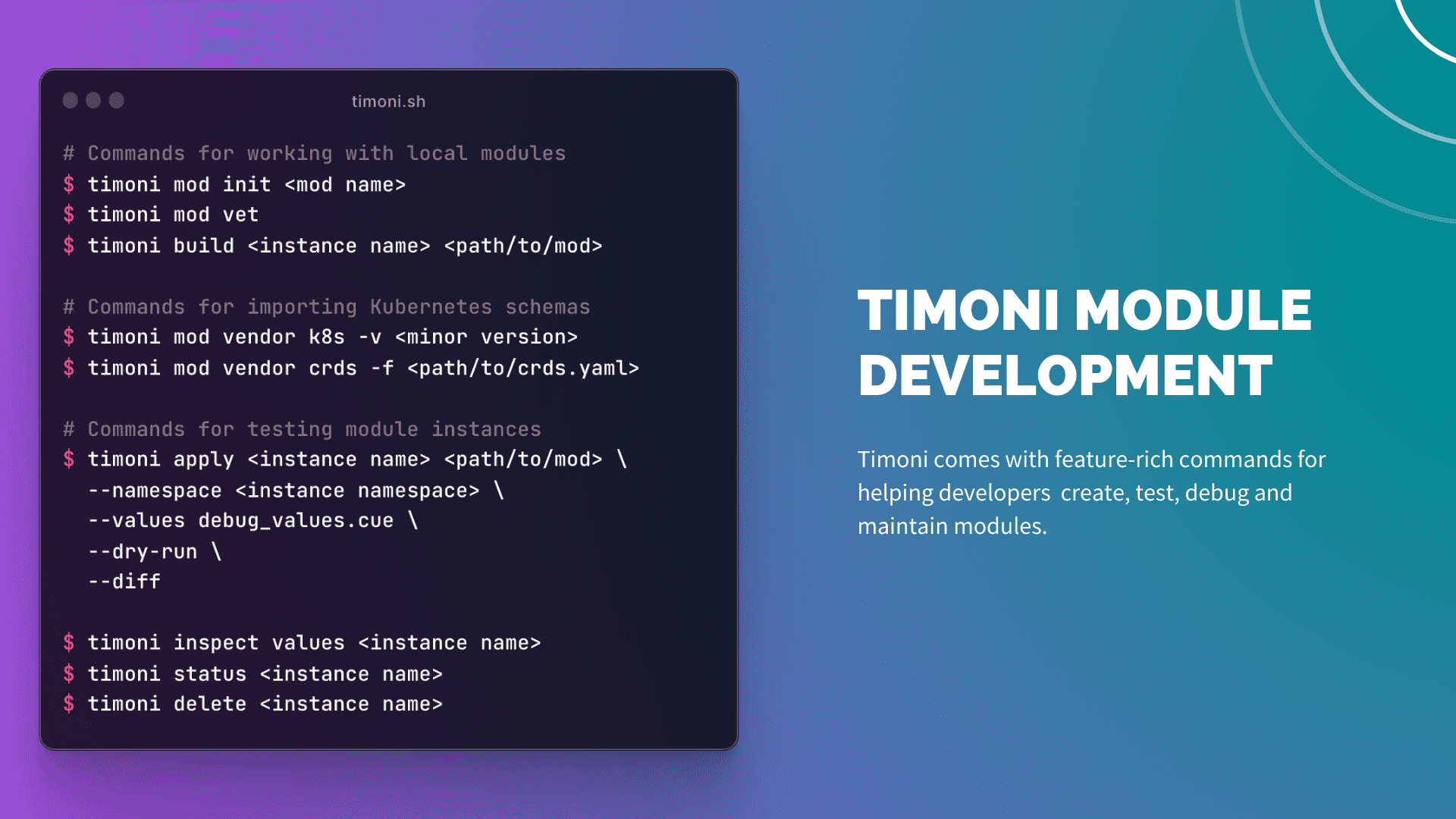 Timoni comes with feature-rich commands for helping developers create, test, debug and maintain modules.