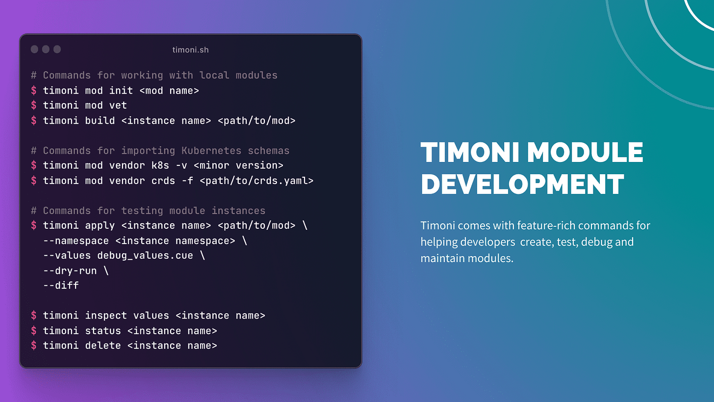 For an in-depth overview of Timoni’s modules, see the documentation at timoni.sh/module.