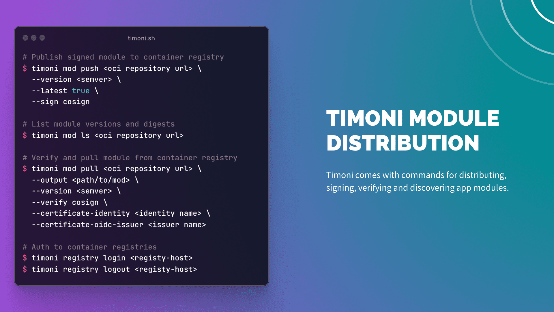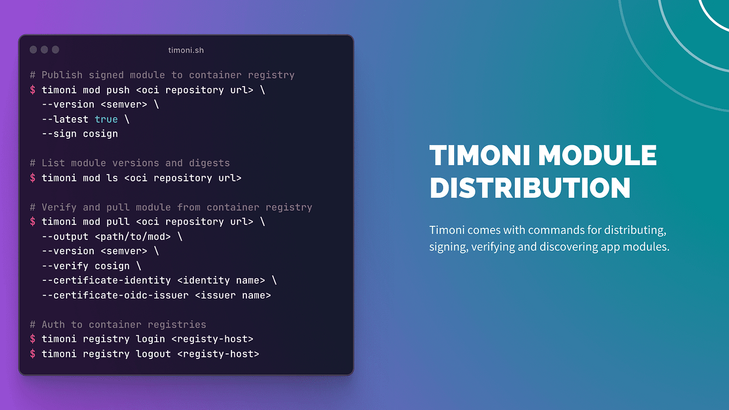 For an in-depth overview of Timoni’s module distribution capabilities, see the documentation at timoni.sh/module-distribution and timoni.sh/module-sign.